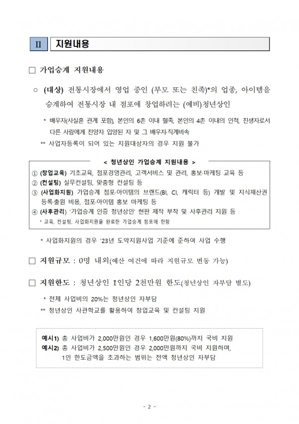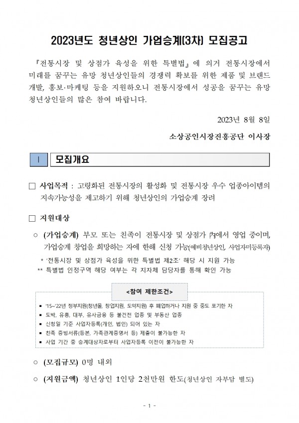 2023년도 청년상인 가업승계(3차) 모집 공고 안내