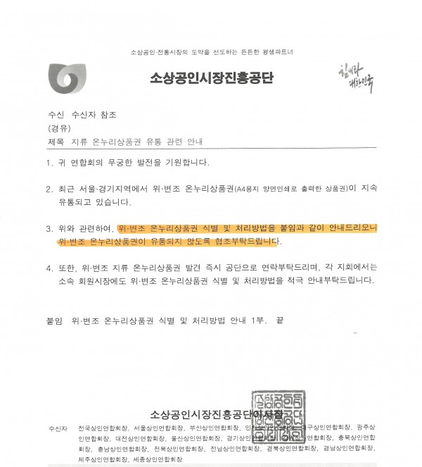 [알림] 위·변조 지류 온누리상품권 유통관련 안내