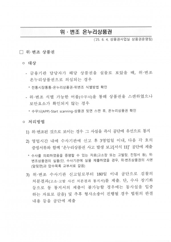 ·변조 지류 온누리상품권 식별 및 처리방법을 확인하시고, 그로인한 피해를 막고 더이상 유통되지 않도록 협조 부탁드립니다.