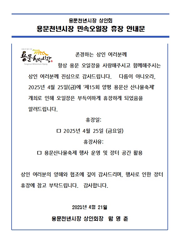[알림] 용문천년시장 민속오일장 휴장 안내문